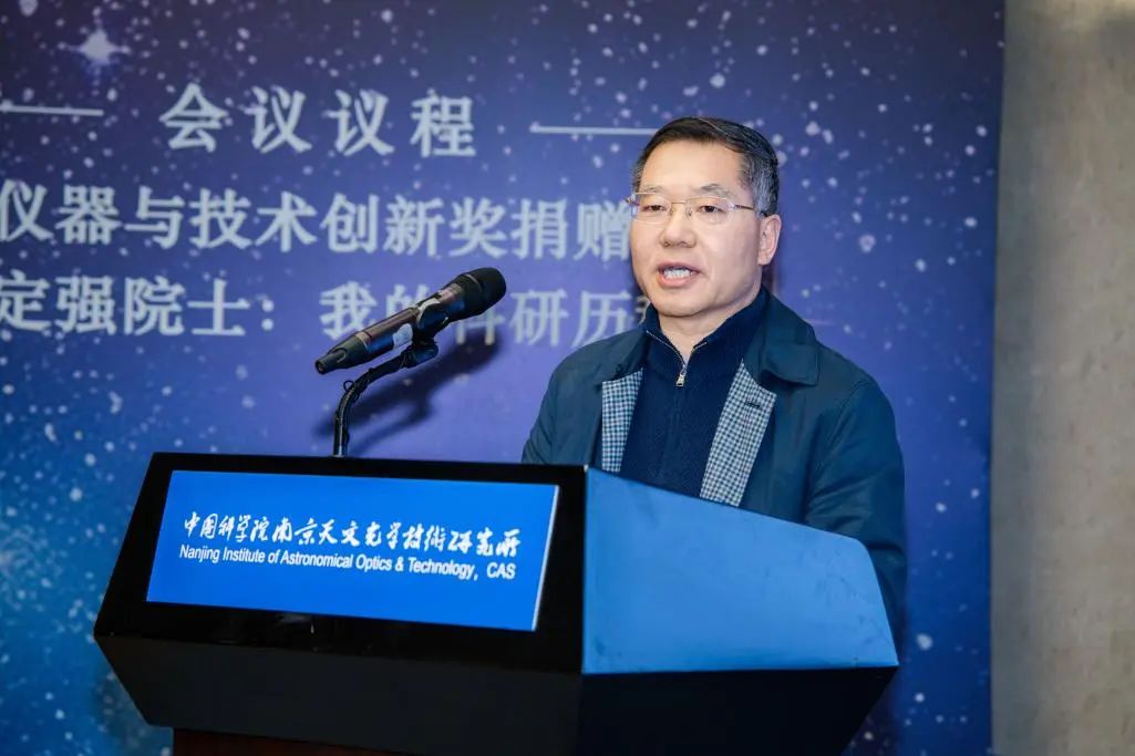 中國(guó)科學(xué)院南京分院分黨組書記、院長(zhǎng)趙長(zhǎng)印研究員在致辭中表示:“蘇定強(qiáng)院士是我國(guó)天文光學(xué)領(lǐng)域的先驅(qū)和領(lǐng)軍人,他用畢生精力推動(dòng)中國(guó)天文事業(yè)從追趕到并跑,再到領(lǐng)跑。他的每一項(xiàng)創(chuàng)新成果,都如同一顆璀璨星辰,照亮了我國(guó)天文事業(yè)發(fā)展的道路?!蹦暇┐髮W(xué)副校長(zhǎng)陸延青教授懷著崇敬之情說道:“蘇定強(qiáng)院士在天文光學(xué)技術(shù)領(lǐng)域作出了系統(tǒng)性、開創(chuàng)性的貢獻(xiàn)。蘇院士將這份沉甸甸的榮譽(yù)轉(zhuǎn)化為對(duì)未來的期許,再次用實(shí)際行動(dòng)詮釋了‘學(xué)高為師,身正為范’的深刻內(nèi)涵。”天儀公司黨委書記、董事長(zhǎng)李海波研究員也發(fā)表了熱情洋溢的致辭:“蘇院士的每一項(xiàng)成果都凝聚著‘敢為人先、追求卓越’的科研精神,也彰顯了他‘為民族振興而創(chuàng)新’的使命擔(dān)當(dāng)。此次捐贈(zèng),是其一生奉獻(xiàn)精神的延續(xù)?!煳膬x器與技術(shù)創(chuàng)新獎(jiǎng)’將成為青年科研人員攀登高峰的階梯,助力他們心無旁騖地探索宇宙奧秘、攻克技術(shù)難關(guān)。”