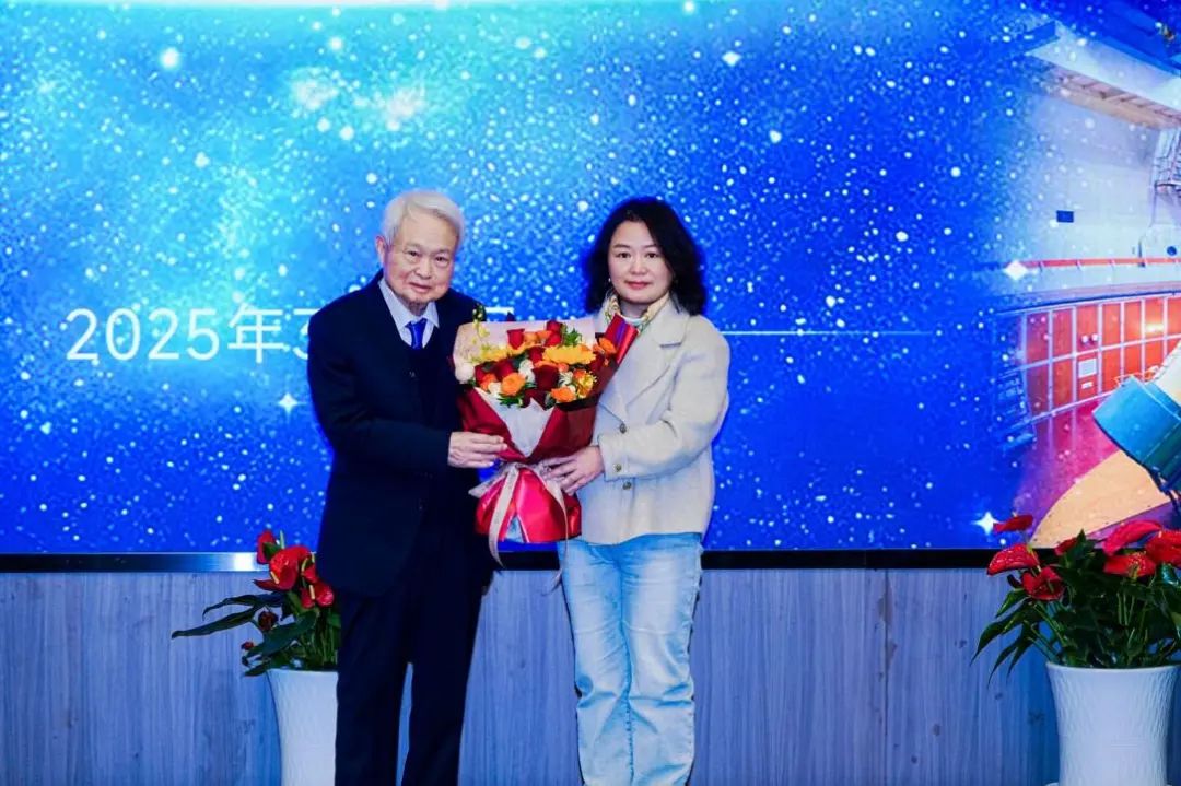 宮雪非所長(zhǎng)為蘇定強(qiáng)院士頒發(fā)捐贈(zèng)證書,南京大學(xué)天文與空間學(xué)院李向東院長(zhǎng)、南京天光所袁祥巖書記和天儀公司李海波董事長(zhǎng)共同為蘇院士頒發(fā)《感謝狀》。最后,青年科研人員代表白華研究員向蘇院士敬獻(xiàn)鮮花。